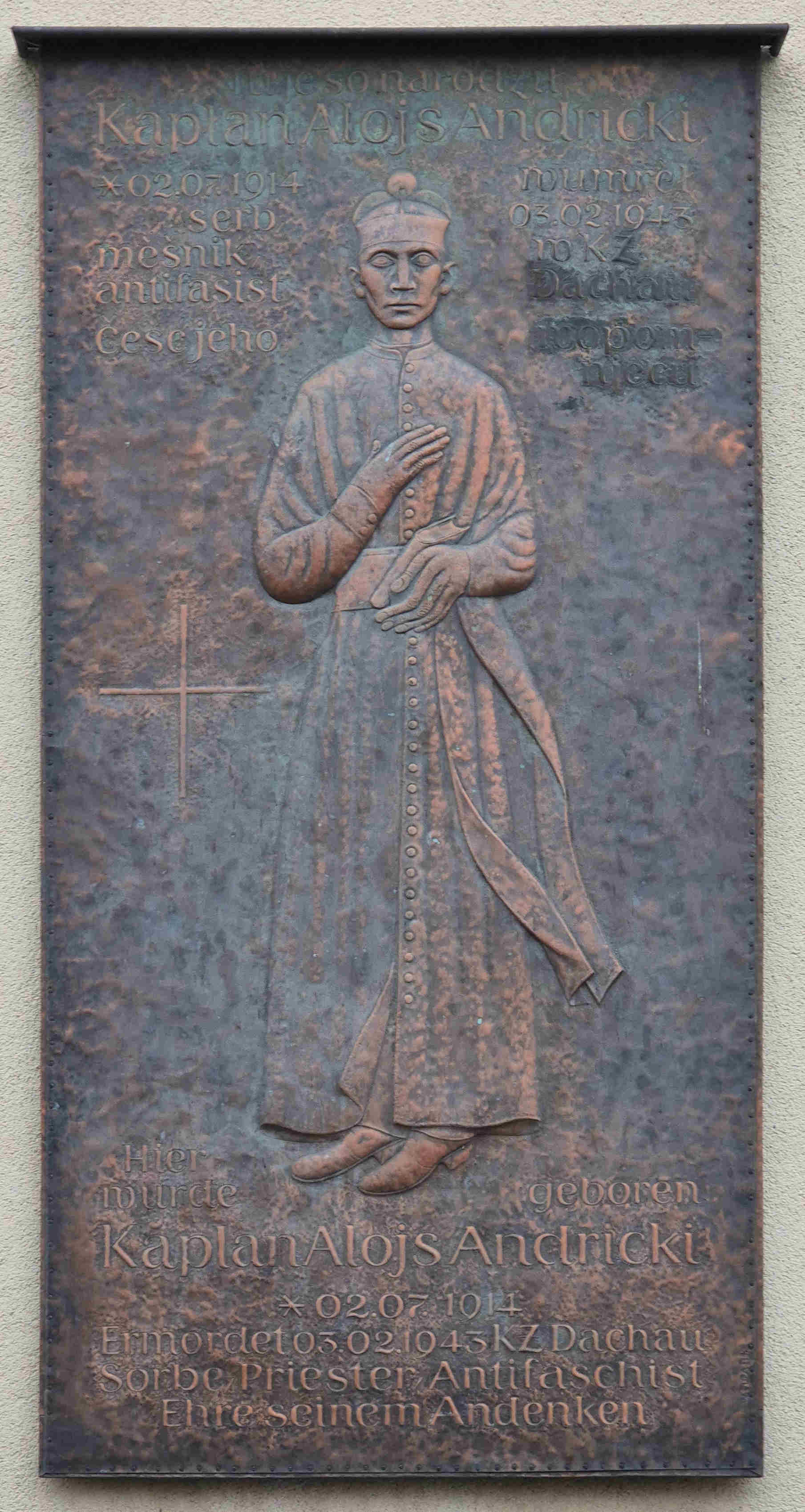 | Njedźelu, 23. septembra 1984, wotkry a poswjeći so na česć kapłana Alojsa Andrickeho składnostnje jeho 70. posmjertnych narodnin na jeho ródnym domje w Radworju (wot 19xx gmejnski zarjad) w nadawku křesćansko-demokratiskeje strony (CDU) zhotowjena koprowa wopomjatna tafla, pokazowaceho antifašistiskeho spjećowarja w měšniskej drasće. Na swjatočnosći přitomni běchu, nimo mnohich česćowarjow njezapomniteho Alojsa Andrickeho z Radworja a dalšich serbskich wjeskow, jeho bliscy přiwuzni: Sotra Marja Rječcyna, bratr prelat Jan Andricki a kuzenk pater Stanisław Nawka SJ (hlej foto). Chór Meja wobrubi swjatočnosć z wjacorymi spěwami. Drohotnu wuměłsku koprowu taflu zhotowi wuměłc Werner Juza z Wachau (1924-2022) . Žórło a lěwe foto: KP 1984; prawe foto: PKL | Am Sonntag, dem 23. September 1984, wurde zu Ehren des Kaplans Alojs Andritzki anlässlich seines 70. Geburtstages an seinem Geburtshaus (seit 19 Gemeindeamt) in Radibor eine in Kupfer getriebene Gedenktafel enthüllt und gesegnet. Sie wurde im Auftrag der christlich-demokratischen Partei (CDU) angefertigt und zeigt den antifaschistischen Widerstandskämpfer Alois Andritzki in Priestertracht. Auf der Feierstunde waren, neben vielen Verehrern des unvergesslichen Alois Andritzki aus Radibor und mehreren sorbischen Dörfern, auch seine nahen Verwandten: Schwester Marija Retschke, Bruder Prälat Jan Andricki und der Cousin Pater Stanislaws Nawka SJ (siehe Foto). Der Chor „Meja“ umrahmte die Feierlichkeit mit einigen sorbischen Liedern. Die wertvolle in Kupfer getriebene Tafel hat der Künstler Werner Juza aus Wachau (1924-2022) gefertigt. |