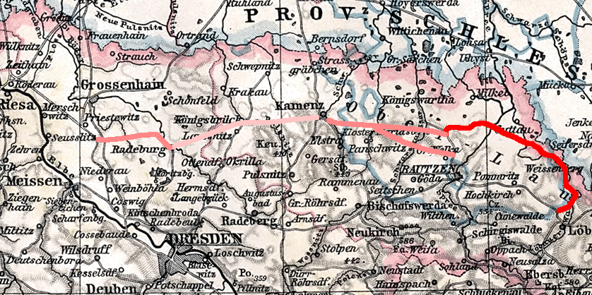— Bei der Regierung ist es eine sichere und ausgemachte Sache, dass es in Kürze eine Bahn durch unsere katholische Lausitz gebaut wird, und zwar Linie von Löbau nach Großenhain. Das Stück von Löbau nach Weißenberg ist, wie bekannt, schon fertig. Von hier aus wird sie nach Radibor führen, wo sie die Linie Bautzen—Königswartha kreuzen wird; weiter durch Luga, Prautitz vorbei an Wićazes im Tal an der Mühle vorbei, oberhalb Zimmermanns Hl. Kreuz, die Pfarrfelder hinter Fulkes, Räckelwitzer Wiesen, Höflein, Dürrwicknitz, Nebelschütz, Jesau, Kamenz, Königsbrück, Großenhain. Noch in diesem Jahr wird mit der Vermessung, Absteckung der Grundstücke und anderen vorbereitenden Arbeiten begonnen.
