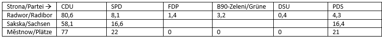 | Dnja 11.09.1994 běchu wólby do Sakskeho sejma Wuslědki hlej tabulka deleka. CDU z ministerskim prezidentom Dr. Kurtom Biedenkopfom je jasny dobyćer wólbow. W parlamenće su jenož 3 strony – CDU, SPD a PDS. Tamne strony zwrěšćichu na 5%-hranicy. Serbja maja dwaj zastupnikaj w parlamenće: za CDU Marka Šimana a za PDS Siegharda Kozela. | Am 11.09.1994 war die Wahl zum Sächsischen Landtag. Die Ergebnisse der Wahl sind in der unteren Tabelle dargestellt. Die CDU mit Ministerpräsident Dr. Kurt Biedenkopf ist der klare Gewinner der Wahl. Im Parlament sind nur 3 Parteien – CDU, SPD und PDS. Die anderen Parteien scheiterten an der 5 %-Klausel. Die Sorben haben zwei Vertreter im Parlament: für die CDU Marko Schiemann und für die PDS Sieghard Kosel. |