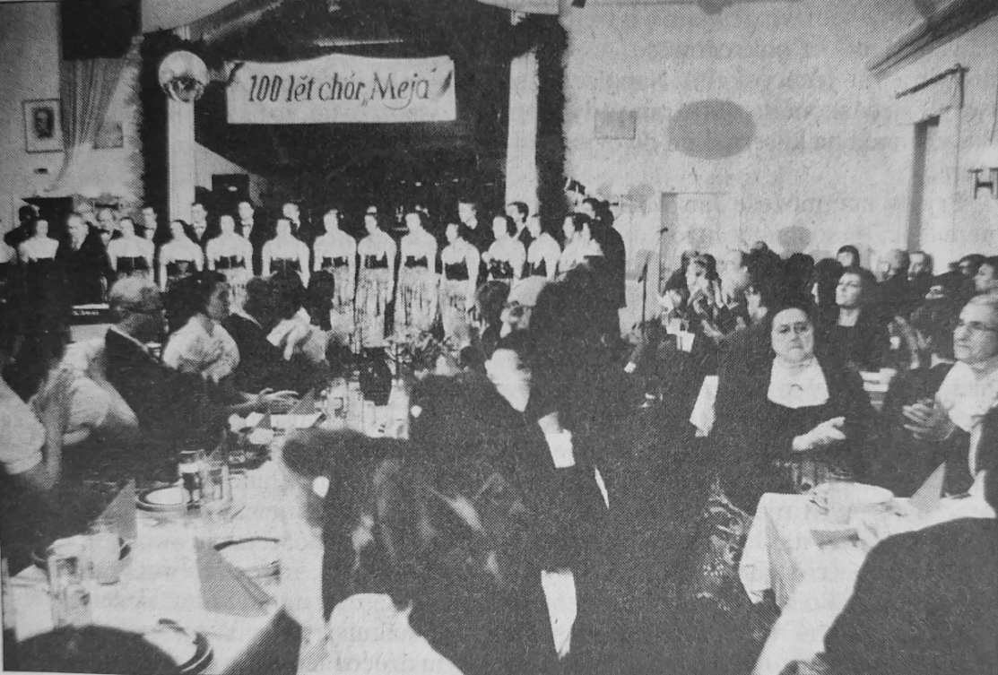 Am 18.01.1995 feierte der Chor Meja den 100 Jahrestag seiner Gründung - und zwar in Dreikretscham in der beliebten Biesoldschen Gaststätte – die Radiborer Gaststätte „Meja“ war ja geschlossen und vielleicht auch zu klein für die etwa 250 Gäste, die zu dem außerordentlichen Jubiläum gekommen waren. Es war ein großartiges Fest mit einem außerordentlichen Programm der 31 aktiven Sänger des Chores „Meja“ und den über eine Stunde andauernden Glückwünschen aller sorbischen Chöre, des Partnerchores aus Baška, vielen Einrichtungen, Institutionen, Organisationen und der sächsischen Regierung – sogar Ministerpräsident Kurz Biedenkopf hatte einen Gruß geschickt. 70 geladene ehemalige Chormitglieder und die Gäste im rappelvollen Saal sangen nach dem Programm und während des Festmahls weiter kräftig bis spät in die Nacht viele unserer schönen volkstümlichen sorbischen Lieder.